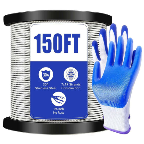 This heavy-duty stainless steel cable is built for tough indoor and outdoor use, perfect for deck railing, outdoor pulleys, marine rigging, and industrial setups. It features high-quality 304 stainless steel with a breaking strength of 6400 pounds to withstand harsh weather, abrasion, and corrosion. Each order includes a 150 ft roll and a pair of gloves for safe handling.