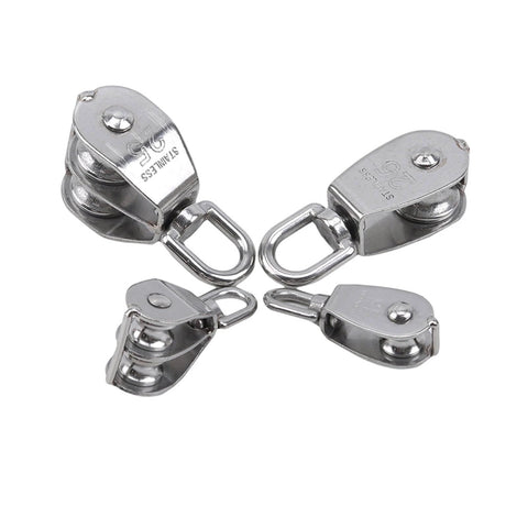 This stainless steel pulley is a hoisting tool (also called a sheave) used to guide a rope and change its direction during lifting and rigging. It's built from corrosion-resistant stainless steel for durability in workshop, boat, or construction site setups.