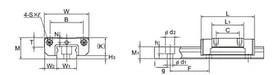 | Model | Rail W | Rail L | Carriage H | Carriage W | Carriage L | Mount Holes | Mount Pitch | g (rail spacing) |
