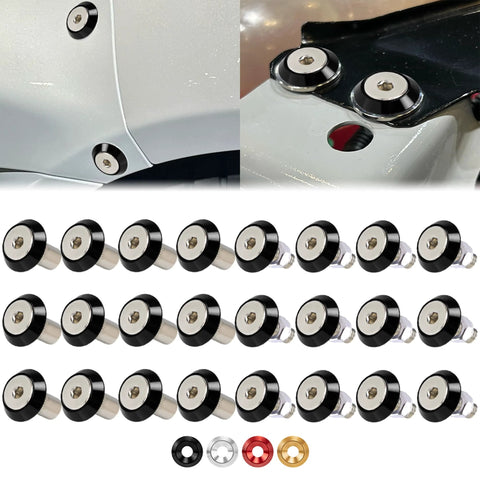 This complete 24-piece kit is built for exterior bodykit mounting and engine bay upgrades. CNC‑machined tapered aluminum washers with an anodized finish deliver a sleek look and lasting durability, while the included stainless hardware and spacers keep installations clean and secure.