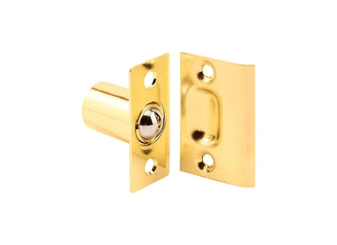 This ball bullet catch is a spring-loaded device designed for interior hinged doors such as closets or pantries. It uses a steel ball and inner spring inside a brass-plated housing, and the barrel is fully adjustable. It can mount on the top edge of the door or along a vertical edge for clean, knob-free operation.