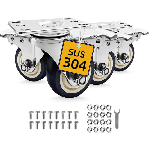 This is a set of four stainless steel swivel caster wheels designed for smooth, controlled movement in furniture, labs, hospitals, restaurants, industrial spaces, and outdoor setups. Built from corrosion resistant 304 stainless steel, these casters are made to handle moisture, frequent cleaning, and daily use while rolling quietly and locking securely.