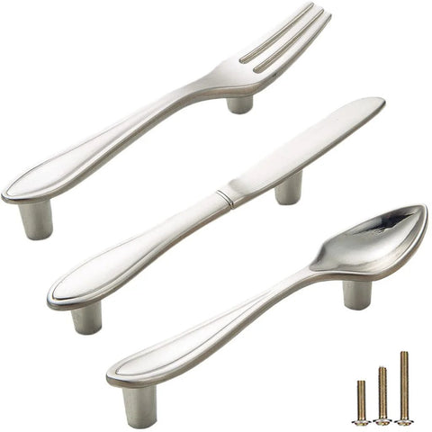 ✔️ Zinc alloy pulls shaped like spoon, fork, knife, 3-inch centers, rust-resistant, includes screws for easy setup