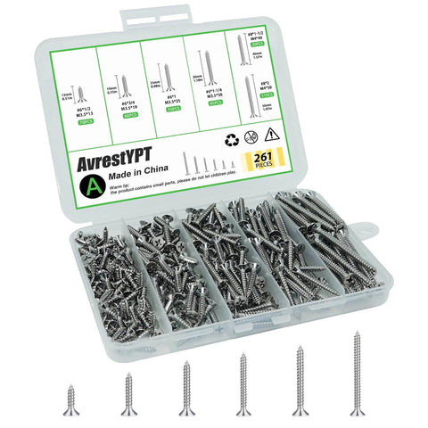 This is a 261-piece wood screw assortment kit made for small woodworking, furniture assembly, drywall work, and general household projects. With multiple sizes included, it’s a handy set for fastening wood, gypsum board, thin sheet metal, and plastic where corrosion resistance and clean driving really matter.
