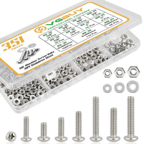 This 351-piece machine screw assortment kit includes matching screws, nuts, and flat washers made for repairs, replacements, and light assembly work in electrical, household, and mechanical projects.