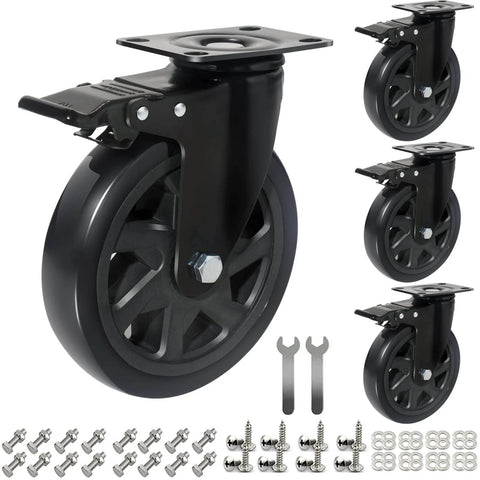 This heavy duty 6 inch caster wheel set is built for carts, workbenches, machinery, and furniture that need strong load support with smooth, quiet movement. Designed for both indoor and outdoor use, these casters combine solid steel construction with controlled braking for safer handling.