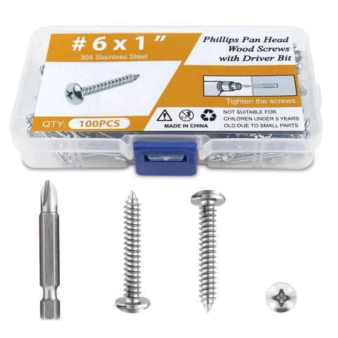 100 Pcs #6 x 1 Inch Pan Head Wood Screws Made from 304 Stainless Steel Featuring Self Tapping Coarse Threads and Sharp Point for Fast Installation in Wood Metal Plastic Drywall and Concrete Projects