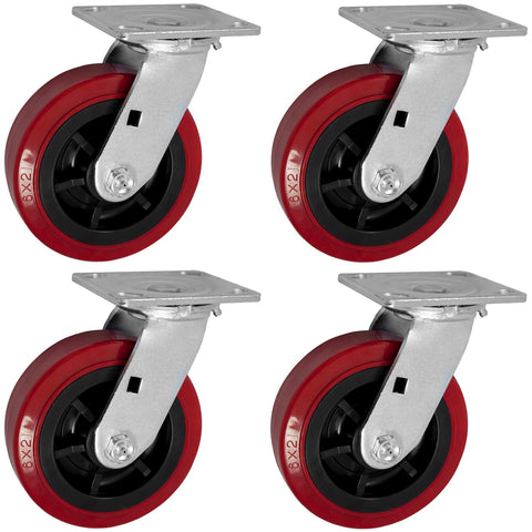 6 inch x 2 inch polyurethane non marking heavy duty swivel casters with red industrial wheels, 4 pack rated for 3600 lb total load capacity