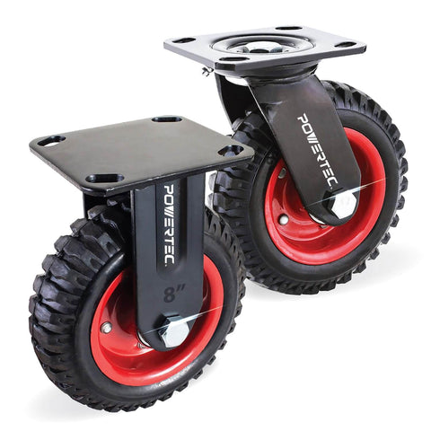This 8 inch heavy duty caster wheel set is designed to handle tough indoor and outdoor jobs with ease. The combo includes one swivel caster for steering and one fixed caster for straight tracking, giving you the perfect balance of control and stability. Each wheel features a solid molded rubber tire with aggressive knobby tread mounted on a steel hub, making it ideal for uneven surfaces like gravel, grass, concrete, and shop floors.