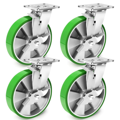8 inch Heavy Duty industrial grade caster set of 4 with swivel casters and brakes, maintenance-free aluminum core PU wheels rated 6000 LBS for industrial equipment