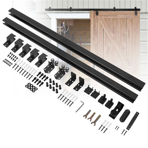 The 8ft exterior barn door hardware kit is a heavy-duty sliding rail system designed for exterior mounting on walls for barns, garages, warehouses, or outside doors. It includes 2 x 48 in splice track sections, 5 track brackets, hangers, stoppers, floor guides, and a door handle (door panel not included) for solid, weather-resistant operation.