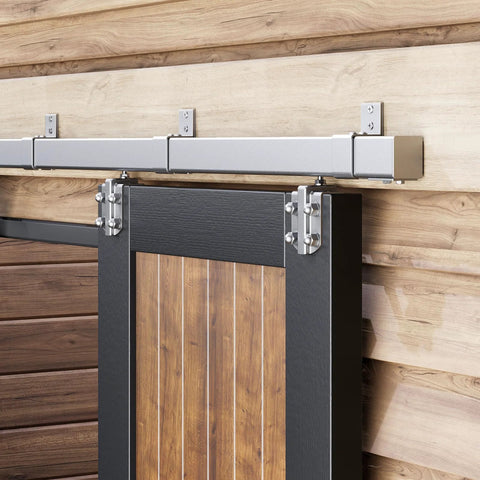 These exterior sliding barn door hardware rails are heavy-duty, weatherproof, and designed for outdoor installations. It supports up to 450 pounds and is ideal for solid wood or composite doors in garages, sheds, or outdoor barns. The kit fits single 48 inch wide doors (1219 mm) with door thickness 1-3/8 inch to 1-3/4 inch (34.9-44.5 mm).