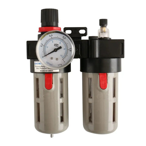 This compact air source treatment unit is designed to clean and regulate compressed air by combining a regulator, filter, and lubricator in one compact housing. It's ideal for use on shop air systems, automated machinery, CNC setups, and workshop pneumatic lines where stable pressure and clean air matter. Built with a sturdy metal and plastic construction, it stands up to everyday use in busy environments.