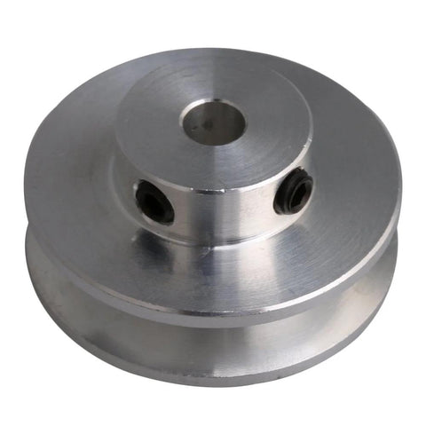 This aluminum single groove pulley is built for compact drives in DIY machines like small drilling rigs, hobby mills, and other light spindle setups. It slides over a 5mm spindle and is secured with two grub screws to prevent slip when under tension.