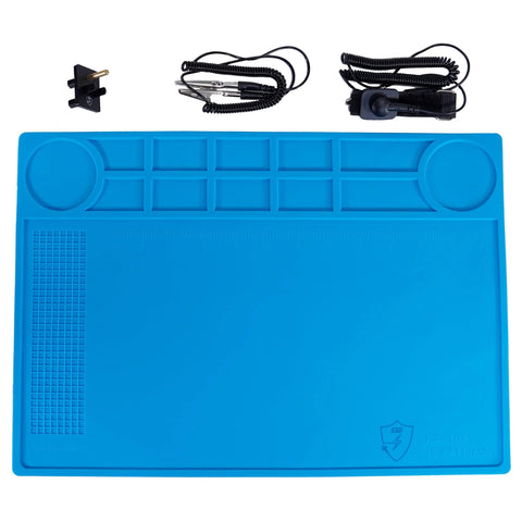 This ESD accessories kit includes an anti-static silicone mat, wrist strap, grounding plug, and grounding cord, designed for electronics repair and assembly to protect sensitive components from static discharge.