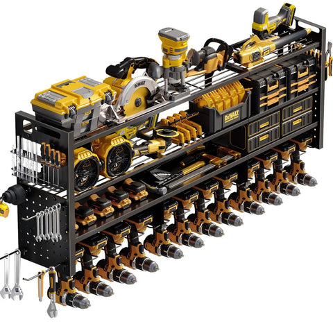 Beefy 49 Inch Wall Mount Power Tool Organizer With 620 Pound Capacity, 12 Cordless Drill Holders, Four Tier Heavy Duty Garage Shelf For Battery Storage And Workshop Organization