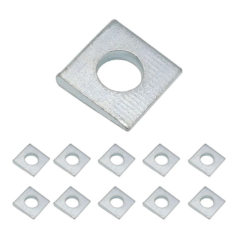 Beveled Square Washer Set delivers a flat, load-distributing surface for bolts on inclined or uneven surfaces; includes 10 hardened carbon steel washers, 3/8 in inner diameter, 7/8 x 7/8 outer, 1.5-5 mm thick, galvanized for corrosion resistance