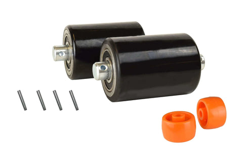 Crown PTH50 pallet jack front load wheels replacement kit, complete pair of polyurethane load wheels with pre greased bearings, axles and accessories, designed specifically to fit Crown manual pallet jack PTH50, non marking industrial grade parts