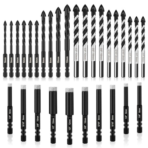 The 30-piece Diamond Masonry Drill Bit Set is a pro-grade kit built for tough jobs. Diamond-coated bits are electroplated with hard diamond particles, delivering a grinding action that minimizes cracking and chipping on concrete, ceramic tile, glass, marble, metal, plastic, and wood. With a wide size range, it's perfect for installing outlets, brackets, and decorative work in home improvement projects.