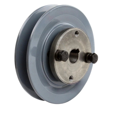 This 4.5 inch cast iron pulley is designed for 5L (B section) belts and comes with a 5/8 inch bushing to fit on a 5/8" shaft. Its two-piece construction delivers a tighter grip and reduced belt slip, making it ideal for small to mid-size drive systems such as air compressors, fans, and conveyors.