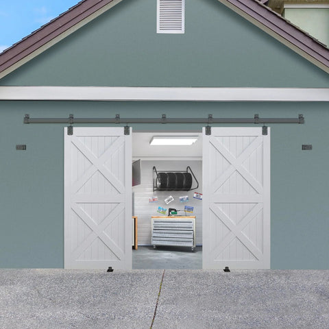 This exterior barn door hardware kit is designed for double-door setups up to 72 inches wide and supports doors up to 450 lb per pair. Built with roll-formed galvanized steel and a rust-proof black finish for outdoor use. Includes track, hangers, floor guides, end caps, brackets, stoppers, and a detailed installation manual.