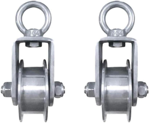 This is a two pack of heavy duty H groove pulleys made from 304 stainless steel, used to guide rope or wire rope along fixed rails in sliding doors, rolling shutters, and industrial trolley systems. Pack size is 2 pulley wheels, built for smooth travel and strong load support indoors or outdoors.