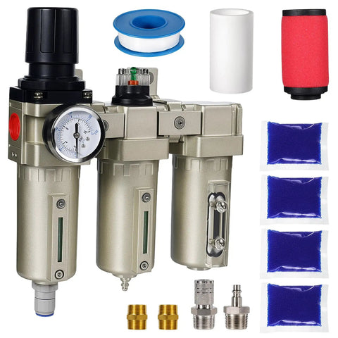 Single-unit, heavy-duty air dryer designed for industrial setups. It combines a water separator, coalescing filter, desiccant bed, and a precision regulator with auto drain in a rugged aluminum body. Ideal for plasma cutters, paint spray guns, and general pneumatic tooling on busy shop floors. Pack: 1 unit.