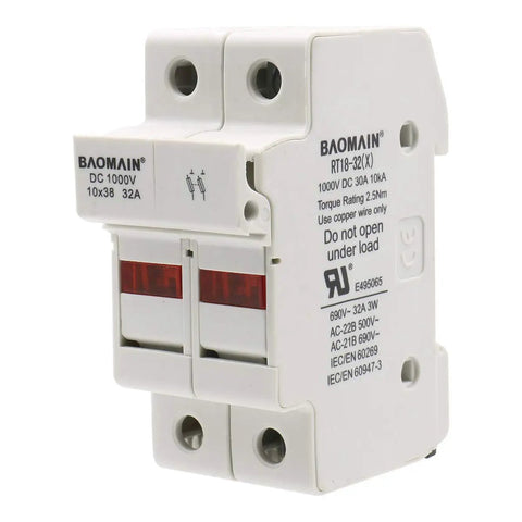 Heavy Duty 2 Pole DIN Rail Fuse Holder For Solar PV Systems, 30A At 1000V DC And 32A At 690V AC, RT18-32 10x38mm, 18-8 AWG, With LED Indicator, 35mm Mount, UR CE Certified