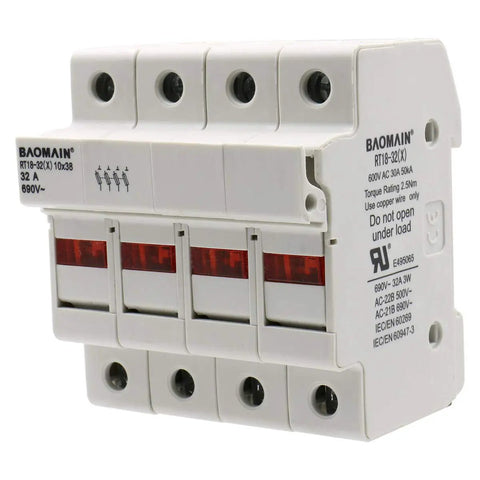 Heavy Duty 4 Pole DIN Rail Fuse Holder for 10x38mm Fuses, 32A 690VAC, RT18-32 Compatible, LED Indicator, 35mm Mount, 18-8 AWG Wiring, UR and CE Certified