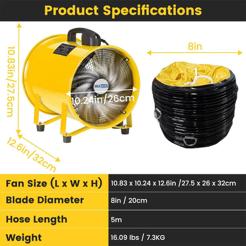 Heavy Duty 8 Inch Air Mover Portable Ventilation Fan With 3500RPM Copper Motor Delivers 1000CFM Airflow 16 Foot Flexible Duct Overheat Protection Cylinder Axial Blower A True Powerhouse For Industrial Exhaust And Quick Drying