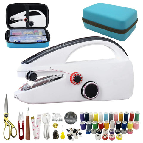 Heavy Duty Handheld Sewing Machine Kit With Blue Leather Storage Case And 110 Piece Sewing Kit, Ultra Portable Mini Sewing Tool For Adults And Beginners, Must Have Home Clothing Repair Essentials, Great Gift