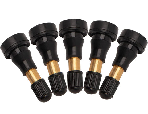 These high-pressure rubber snap-in tire valve stems are built with a brass core and EPDM rubber, finished in black for a sleek look. They replace damaged stems and keep tires properly inflated on cars, trucks, trailers, lawn equipment, ATVs, and motorcycles, fitting wheels with a 0.453-inch valve hole.