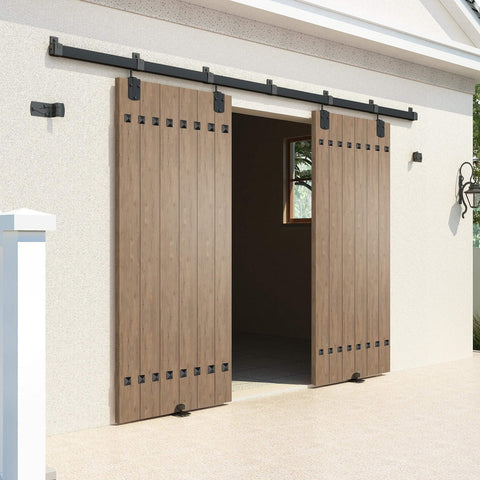 Outdoor sliding barn door hardware kits provide a robust, weather-ready track and roller system to install exterior barn doors on sheds, barns, garages, or entryways facing the elements.