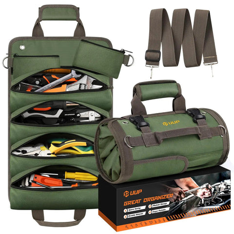 Heavy Duty Roll Up Tool Bag Portable Soft Tool Storage Foldable Organizer With Small Pockets Water Resistant PVC Coated Oxford For Mechanics Dads Home Garage Green