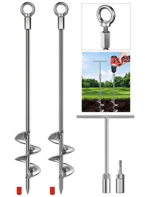 This Heavy Duty Shed Anchor Kit includes two 30-inch (762 mm) ground anchors built for windy outdoor setups. Each anchor uses a chrome-plated, fully welded spiral design that bites into soil for a solid hold, making it ideal for sheds, gazebos, carports, greenhouses, and tarps. The kit includes a T-handle wrench, drill bit adaptor, and protective caps for safe transport and storage. Use on soft or sandy ground for best grip; avoid rocky or root-dense soil.