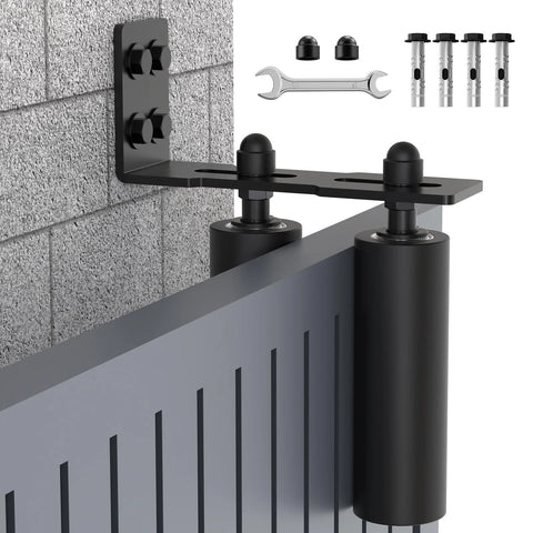 This heavy-duty sliding gate roller hardware kit includes a steel wall-mount bracket and a durable nylon roller guide designed for rolling or sliding doors in garages, wood gates, sheds, and barn-style setups. It delivers smooth, quiet operation and long-lasting performance even in outdoor or dusty environments.
