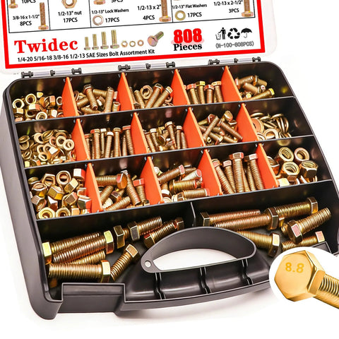 This heavy-duty SAE hex bolt and nut set includes 808 pieces in 19 sizes, all zinc-plated for rust resistance. It’s designed for automotive, machinery, furniture, construction, and DIY projects, and comes in a sturdy transparent storage box for easy organization.