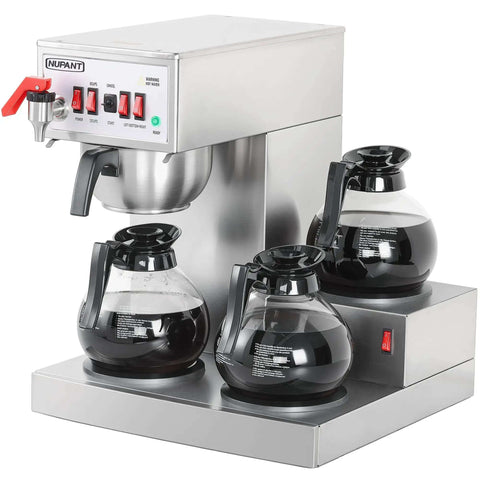This heavy-duty commercial drip coffee maker brews 12 cups in a batch and runs three glass carafes across three warming plates, delivering up to 36 cups hot and ready to serve. Perfect for busy offices, cafes, restaurants, churches, and break rooms where fast beverage service matters. Includes three glass carafes and three warmers for simultaneous brewing and serving.