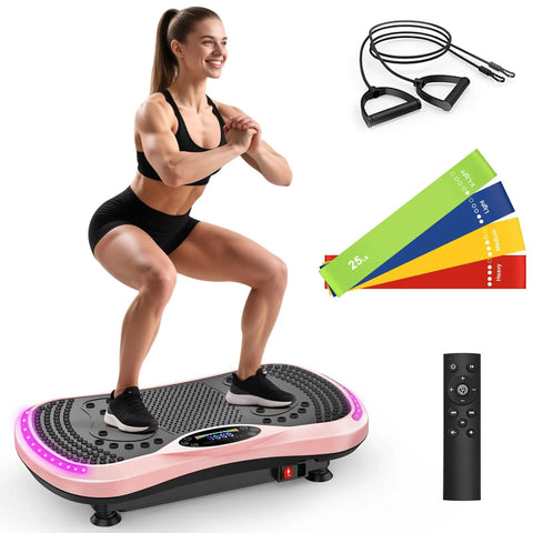 Home Vibration Plate for Lymphatic Drainage and Full Body Toning with 9 Modes and 200 Speed Levels, 400 Lb Weight Capacity, Includes 2 Loop Bands and 4 Resistance Straps, Pink