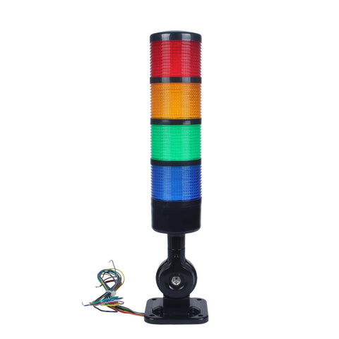 Industrial LED Signal Tower Stack Lights with Rotatable Base 4 Layer Warning LEDs and 90dB Buzzer 110V 220V AC Steady or Flashing Modes Black Housing for Boss Level Visibility High Intensity Low Power 100000 Hour Lifespan