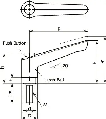 A 6mm male screw type plastic clamp lever with push button.When the lever is pulled to adjustment position, the push button assists in transmitting the force, assisting the operation. Stainless steel threading.