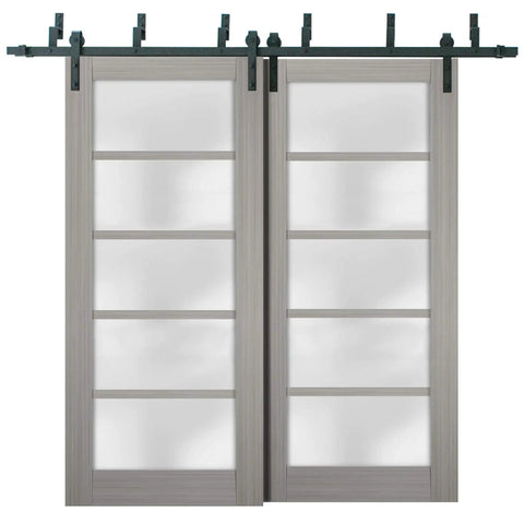 Quadro 4002 Interior Barn Bypass Sliding Doors With Frosted Glass MDF Black Finish 56x96 Inches Modern Style Set With Heavy Duty Rails Hangers Floor Guides Door Stops Anti Jump Pins And Screws Hardware Included