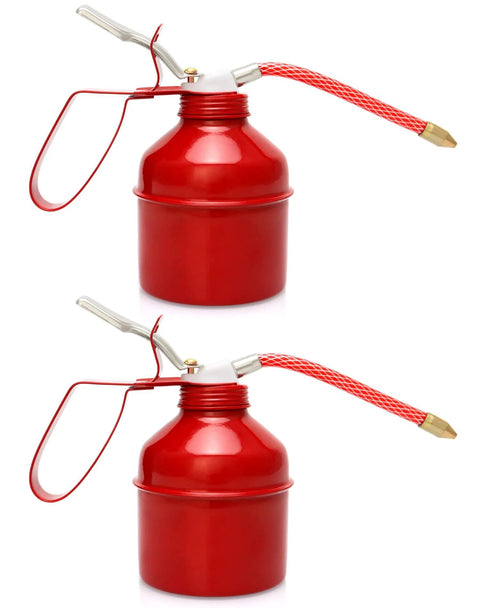 Red Powder Coated Steel Pistol Style Oil Can 12 Ounce 400 Ml With Flexible Tube Manual Pump Oiler 2 Pack For Tight Space Lubrication Dome Shaped Bottle Durable Classic Oiler By QWORK