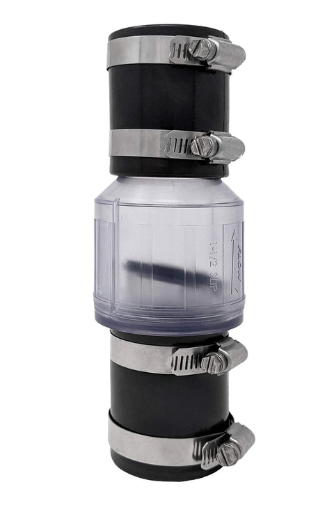 This silent valve is designed for 1-1/2 inch piping and adds quiet operation to your sump pump system. The clear valve body lets you visually confirm water movement and detect clogs, while the Buna-N couplings and stainless clamps ensure quick, tool-free installation. By keeping pumped water in the discharge line, it helps prevent backflow and can extend pump life.
