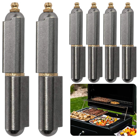 Moonoom 6-pack heavy-duty weldable barrel hinges designed for attaching BBQ lids, metal doors, gates, driveways and ramps. Made from carbon steel with a rust-resistant finish, these hinges weld securely on one end and provide a detachable mounting plate on the other for quick maintenance. They offer a smooth 360-degree rotation and reliable performance in outdoor and indoor settings.