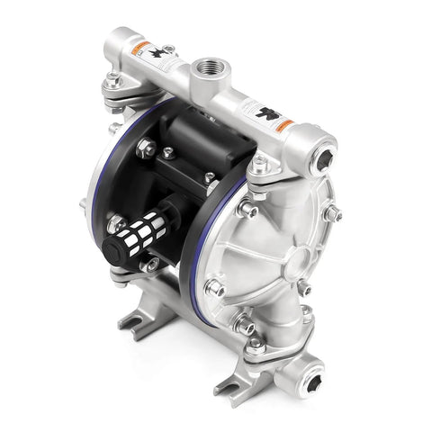 Stainless Steel Pneumatic Double Diaphragm Pump Built For Tough Jobs With 8.8 GPM Flow, 120 PSI Max, Half Inch Inlet And Outlet, PTFE Seals, 304 Stainless Construction, Ideal For Low Viscosity Liquids Like Hydraulic Fluid, Diesel, Coatings And More