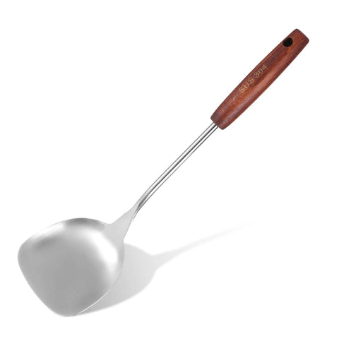 This stainless steel wok spatula is a long-handled kitchen tool designed for stirring, flipping, and serving in high-heat wok cooking. Its wooden handle provides a comfortable, secure grip for both home cooks and professional chefs.