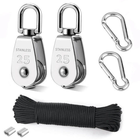 ✔️ Heavy duty stainless steel pulleys, 66 ft rope, 150 kg load