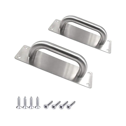 These beefy stainless steel door pull handles come in a convenient two-pack, designed for barn doors, sheds, cupboards, toilets, cabinets, and garages. The backplate adds mounting strength for high-traffic doors and heavy use environments.