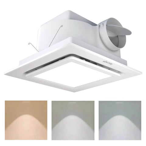 This compact, square 12-inch bathroom exhaust fan combines high airflow with integrated LED lighting. It's designed for bathrooms, powder rooms, restrooms, and small offices where moisture, odors, and lighting need to be managed in one tidy unit.